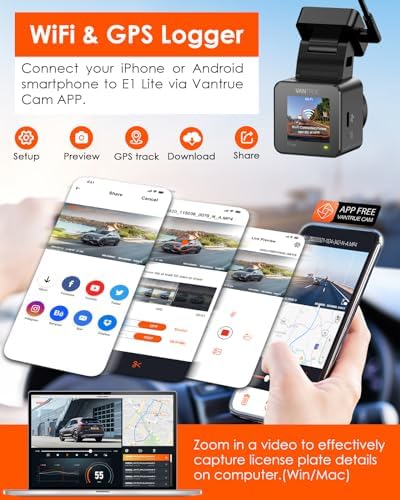 [ Compact Full HD Dash Cam ]Vantrue E1 Lite mini dash cam captures sharp video at 1920*1080p@30fps with a 160-degree viewing angle, effectively minimizing blind spots. Featuring HDR (High Dynamic Range) technology and an F1.8 wide aperture, it ensures clear visibility of vehicle license plates and the detection of minor details, both day and night. Its mini and compact design does not obstruct the driving view, enhancing safety. Perfect mini dash camera for cars, trucks, SUVs, pickups, and more. [ Built in WiFi & Free App ] This 1080P dash camera comes with App(No Subscription) for Android or iOS smartphones to get a live stream, download videos, track gps data, change settings, edit and share your footage simple. Videos can be shared to YouTube, Twitter, Facebook, or the social media platform of your choice with the tap of a finger, allowing you to share bits and pieces of any journey with all of your friends. [ Dash Cam with GPS and Speed Tracking ] Built in GPS allows the vehicle dashboard cam to record your speed in KMH or MPH, location, route and direction of travel, and the GPS data can be easily tracked via smartphone App or PC, which could be used as extra evidence in an insurance case. [ Hands Free Voice Control ] Voice control function (only available in English, Japanese, Russian and Chinese) lets you control your dashboard camera with spoken commands. With your hands on wheel, you can speak commands to save video, take photo, start video, turn on/off audio, turn on /off WiFi, turn on/off screen. Everything is easier and more convenient. [ 24 Hours Parking Mode ] This dashcam will auto switch to parking mode while your car is parked. Collision detection or buffered motion sensor can be triggered by impact or movement, low bitrate or low frame rate mode keeps recording continuously with low power consumption. Which protects your vehicle from hit and runs and theft attempts, with emergency videos saved to a separate locked folder for the ultimate peace of mind. (Need to order Vantrue hardwire kit separately) [ Credible Car Accident Attorneys ] G-sensor automatically sense impact/collisions and save the emergency videos to a separate event folder so that you can view afterward. Seamless Loop recording function auto overwrite the oldest file ensuring that your camera continues to record, even if the SD card becomes full. Housing up to 512GB external memory card. (Need to buy separately, recommend vantrue sd card) [ Easy Installation & 18 Months Warranty ] 1.54 inch LCD Screen – Easy access to live footage and settings, advanced type c usb port enables charging and transferring data conveniently, magnetic mount allowing you to detach the camera from the mount easily without having to mess with the cable, small enough to hide behind your rear view mirror, built in super capacitor to survive extreme weather, 18 months extended warranty.