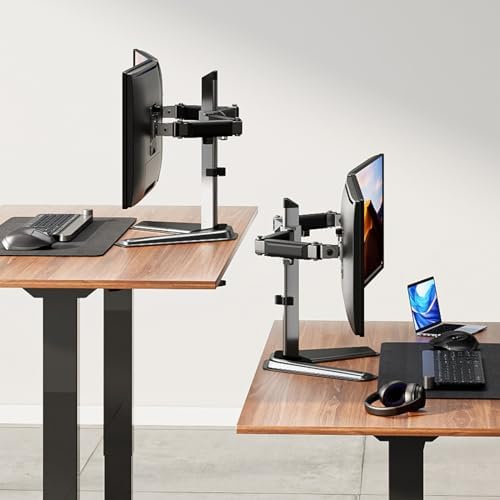 Compatibility: The monitor stand mount fits most flat screens, TVs, and monitors up to 32 inches, and supports weight up to 19.8 lbs per arm. For monitor with Mounting Pattern 75x75mm or 100x100mm. The plates are detachable and height adjustable. The free-standing V-Base can stably fit any desk Double Benefits: This dual monitor desk stand has double efficiency and productivity to make working or relaxing that much more comfortable. Increasing more usable desktop space can help provide your displays with a new range of adaptive positions. Arms extend and retract with full height adjustable on a 16.9” height pole, +/-70° tilt and swivel to change reading angles and 360° rotate from landscape to portrait mode Sturdy Construction: The heavy-duty base stand provides strong and stable support for your monitor screens. The elegant engineering keeps your work space looking modern and sleek Dynamic: Our dual monitor arm is easily adjustable, allowing you to work in a more comfortable, ergonomically correct position to reduce neck and eye strain. The contemporary design will surely assimilate into nearly any environment, it is ideal for homes, dorms, schools, businesses, offices, IT networks, manufacturing plants, etc Package Includes: 1 x WALI Free Standing Dual Monitor Mount (Black), 1 x Mounting Hardware Kit, 1 x User Manual, experienced and friendly US-based customer support available to assist 7 days a week