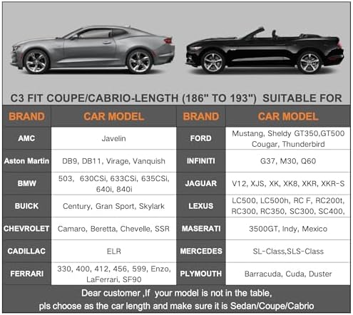【Heavy Duty Material】1 Kayme 7 layers thickened truck cover is made of the latest 100% waterproof heavy duty material, It's makes the cover stronger and durable. 2 This material can resist minimum temperature up to -100℉,For your car Snowproof and frostproof in winter. 3 The inner layer is soft cotton to protect the car paint better. 【Unique Design】 Windproof straps at Front&Rear to prevent the cover from being blown away in heavy wind. Storage bag , Store your cover easily when not used. 4pcs Reflective stripes, Reminder others at night. 【Dimension C3】Universal fit for Coupe/Sedan/Cabriolet which length is 186-193 inch (Not for hatchback and SUV ). Suitable for Ford Mustang,Shelby, Chevy Camaro, Jaguar XK, XKR,Etc. 【Complete Protection】Kayme all weather car covers like a moving garage, Will be scratch resistant sun-proof, windproof, hailproof, snow-proof, dustproof in extreme weather. It provides complete protection for your vehicle. 【Warm Reminder】— Please check the car details before your purchase. 1 The car a sedan hatchback or Suv? 2 What is the car Length? We provide 12 months full service. If you have other questions, please feel free to contact us, we will try our best to solve it for you in the first time.