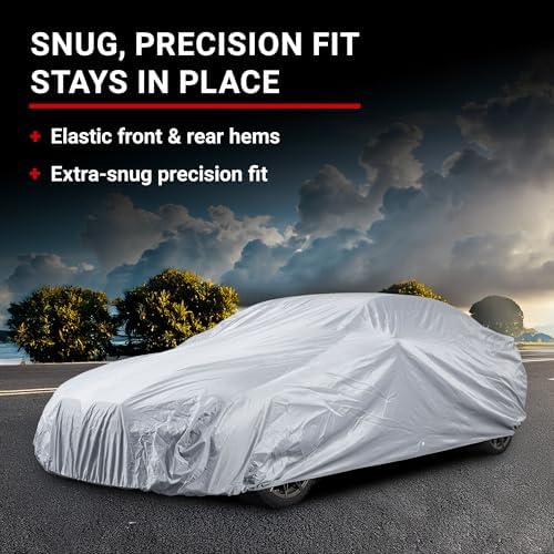 Confirm Your Vehicle Fit in the SIZE CHART! See image 2 to find your vehicle in the SIZE CHART; CarCovers’ Weatherproof Light Cover snugly fits a variety of sedans and small automobiles, from sports cars and classic coupes to luxury sedans Multi-Layer Deluxe Material for Good Weather Protection: Made with a special UV-resistant polypropylene, Weatherproof Light reliably protects against water, snow, sun and dirt damage; designed to protect your sensitive clear coat/paint finish against sediment accumulation and environmental damage, such as tree sap and acid rain, it’s ideal for outdoor parking in all sorts of places, from sunny to high-moisture climates (and even includes reinforced built-in grommets for theft protection) Breathable, Scratch-Resistant, Durable: A layer of micro-porous film sandwiched between its polypropylene layers ensures excellent breathability and natural resistance to rot and odor-causing buildup, while double-stitched seams provide fantastic cover durability and help retain the semi-custom shape of your cover Stretches for an Extra-Snug Fit, Guaranteed: The elastic front and rear hems enable the fabric to stretch and conform to every contour of your car for a custom-like fit; our car covers also accommodate your mirrors without pocketing them (preventing cover deterioration or ripping as there are NO gaps/pockets) Antenna Patch Kit & Storage Bag Included: If your car does not have a retractable antenna, use the included DIY patch kit to reinforce an antenna hole; the storage bag fits in your trunk for safekeeping and easy storage compartment between uses