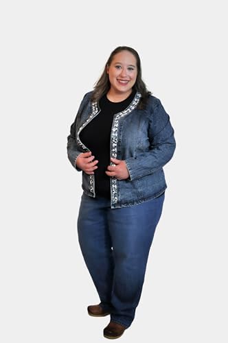 CCCS Women's Denim Jacket, Kiss Front, Long Sleeve, Hand Beaded with Heatseal rhinestones Size XSmall to 3X, Medium Wash